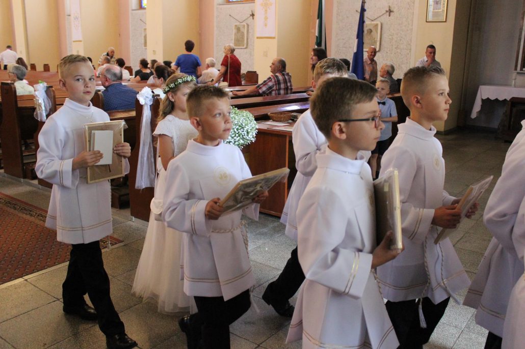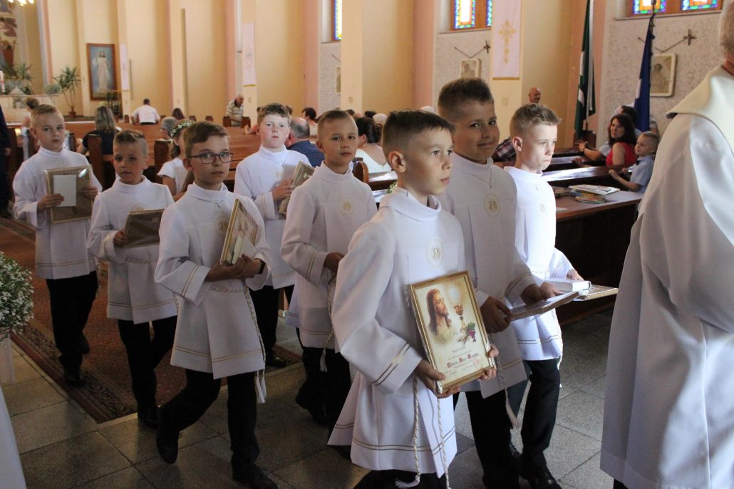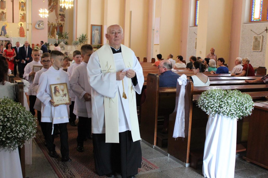 Pierwsza Komunia to wydarzenie, do którego dzieci przygotowywały się bardzo sumiennie przez cały rok, dlatego pełne emocji oczekiwały na przyjęcie Pana Jezusa do swego serca. Uroczystość rozpoczęła się przed wejściem do kościoła, gdzie przybyły ksiądz proboszcz Marcin Tomczyk powitał i pobłogosławił wszystkie dzieci. Następnie błogosławieństwa udzielili im rodzice. Cała uroczystość przebiegła w podniosłej atmosferze pełnej uśmiechów i wzruszeń. Na zakończenie dzieci podziękowały księdzu proboszczowi, rodzicom, katechetom i służbie ołtarza za przygotowanie ich do sakramentu Pierwszej Komunii Świętej.